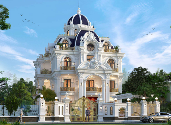 Ngôi biệt thự lâu đài 4 tầng này là biểu tượng của sự xa hoa và quyền quý, lấy cảm hứng từ kiến trúc hoàng gia châu Âu. Màu trắng sang trọng kết hợp mái vòm xanh đậm cùng các chi tiết phù điêu tinh xảo đã tạo nên một tổng thể lộng lẫy và đầy cuốn hút.