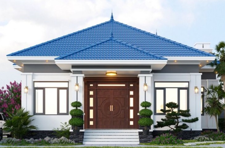 Mẫu biệt thự vườn 1 tầng 10x20m gây ấn tượng bởi kiến trúc mái Nhật xanh nổi bật, vừa bề thế vừa thanh thoát. Hệ mái có độ dốc cao, giúp thoát nước nhanh, chống nóng tốt và tạo nét cân đối, sang trọng cho tổng thể công trình.