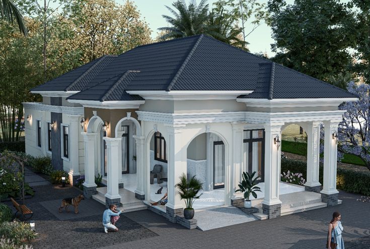 Nhà vườn 1 tầng phong cách tân cổ điển mái Nhật, mặt tiền hiên rộng có vòm cong và cột trang trí, không gian mở 3–4 phòng ngủ, ưu tiên thoáng – sáng – kết nối sân vườn. Bố trí cho lô đất 8×18m; có thể chừa sân trước 3,5–4,0m và sân sau 1,5–2,0m để đúng “chất” nhà vườn.