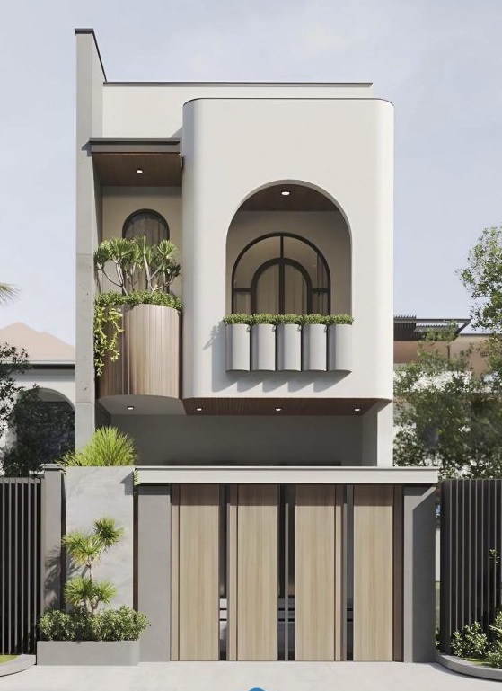 Hiện đại kết hợp đường cong: các ô cửa vòm và khối bo tròn làm mặt tiền mềm mại, sang trọng.