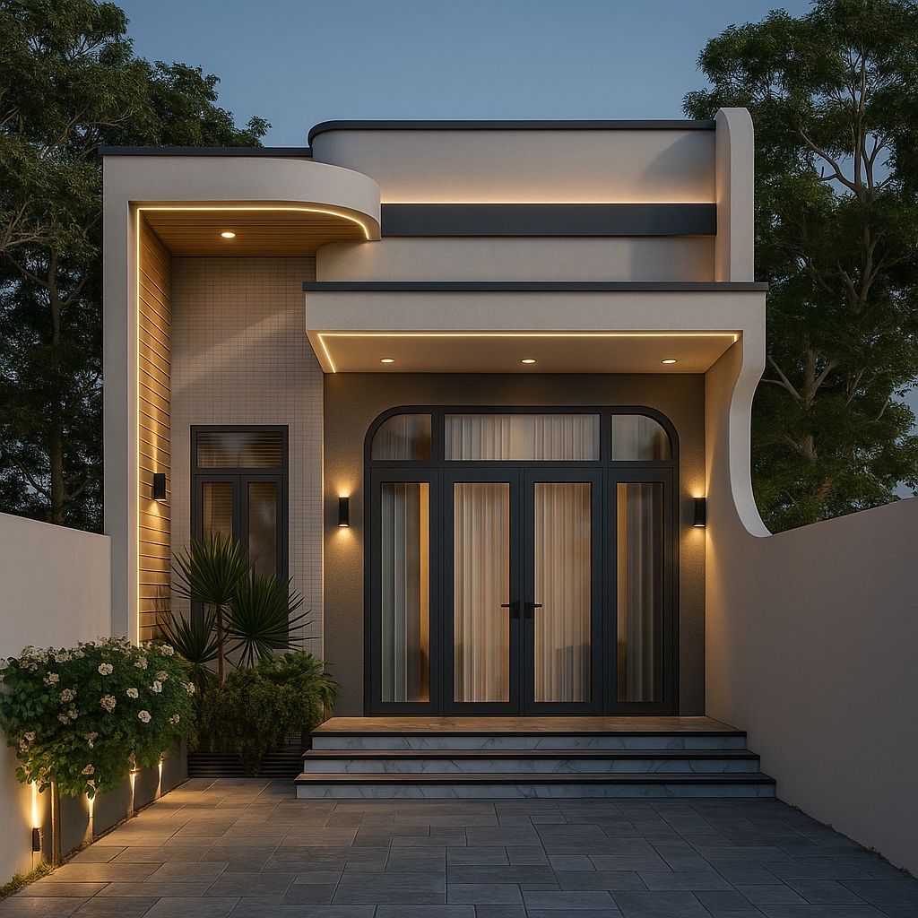 Mặt tiền nổi bật với các đường nét bo cong mềm mại, kết hợp hệ đèn LED giúp ngôi nhà đẹp và ấn tượng cả ban ngày lẫn ban đêm.