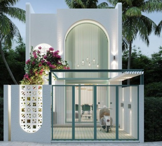 Mặt tiền ngôi nhà gây ấn tượng mạnh với hệ cửa kính lớn và vòm cong cao giúp lấy sáng tối đa, tạo cảm giác thông thoáng và sang trọng. Hàng rào kết hợp lam sắt dọc và ô gạch bông gió vừa đảm bảo an toàn, vừa mang đến sự thoáng đãng, nhẹ nhàng cho tổng thể. Sự xuất hiện của cây xanh và hoa giấy điểm xuyết càng làm cho không gian thêm gần gũi, hài hòa với thiên nhiên.