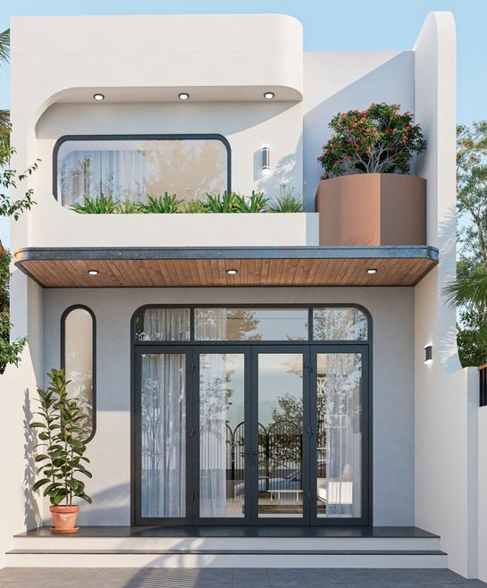 Mặt tiền hiện đại – tối giản, với mảng tường bo tròn mềm mại.