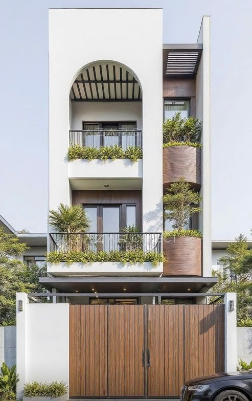 Mặt tiền: kết hợp mảng tường trắng, gỗ nhựa ngoài trời và lan can sắt hộp sơn tĩnh điện.