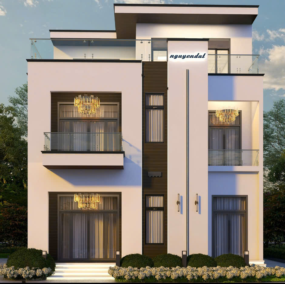 Ngôi nhà mang dáng vẻ hiện đại với gam màu trắng – nâu sang trọng, kết hợp hệ cửa kính lớn giúp tận dụng ánh sáng tự nhiên. Mặt tiền nhấn mạnh bởi các mảng ốp gỗ, ban công kính và hệ đèn trang trí tạo sự bề thế, cân đối. Cảnh quan xanh xung quanh góp phần làm mềm kiến trúc, tạo cảm giác gần gũi với thiên nhiên.