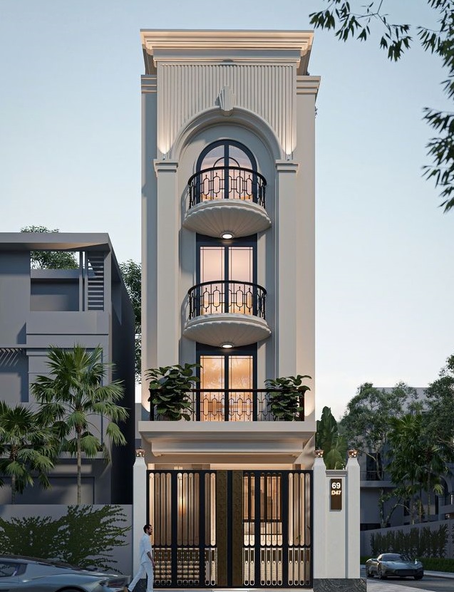 Phong cách: Tân cổ điển hiện đại, đặc trưng bởi hệ cột phào chỉ tinh tế, các vòm cửa cong tạo điểm nhấn sang trọng, nhưng vẫn giản lược chi tiết để phù hợp bối cảnh nhà phố.