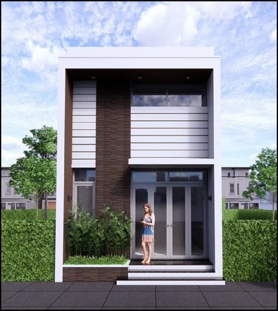 Thiết kế hiện đại, trẻ trung với mảng ốp gạch và lam nhựa giả gỗ tạo điểm nhấn.