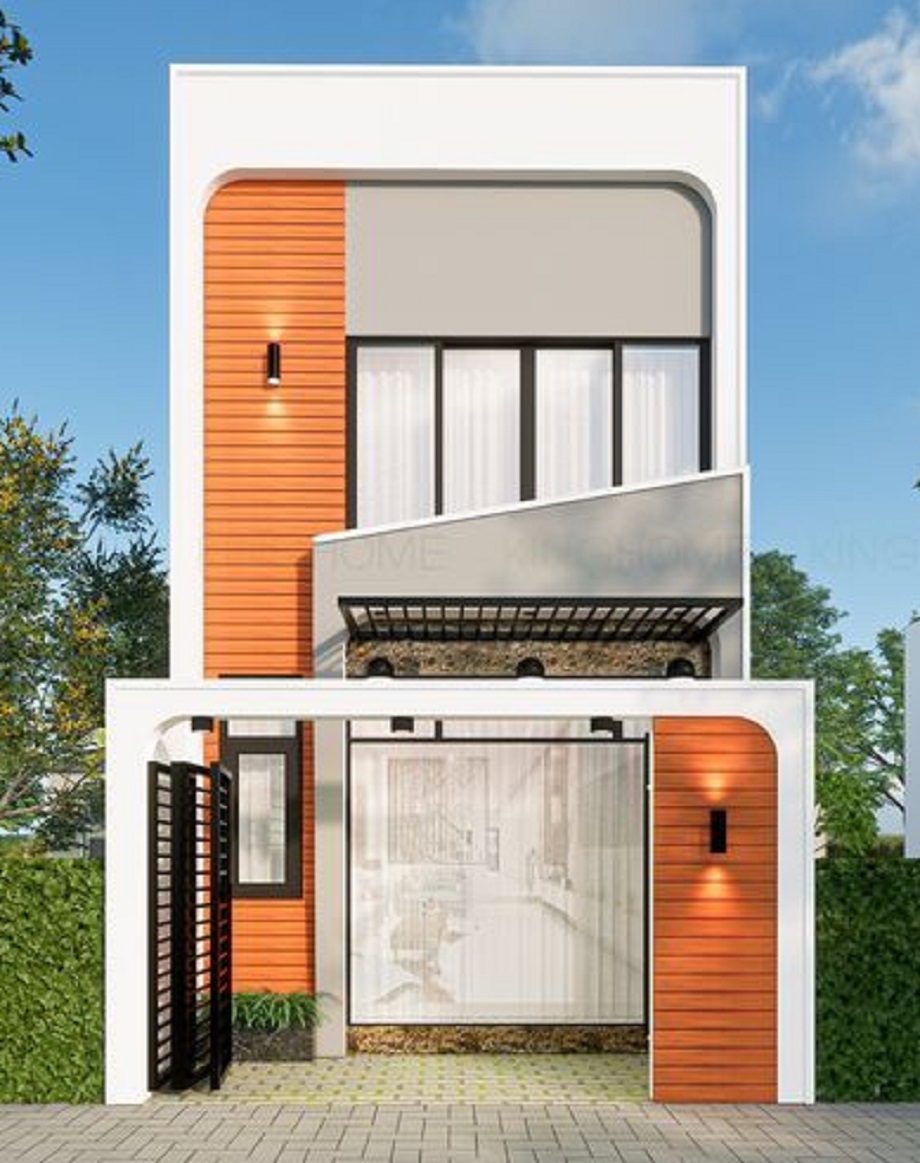 Mặt tiền trẻ trung với mảng gỗ nhựa ốp màu cam kết hợp trắng – xám.