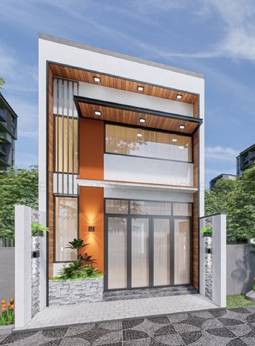 Phong cách hiện đại, trẻ trung với mảng ốp gỗ trần và điểm nhấn cam – trắng.