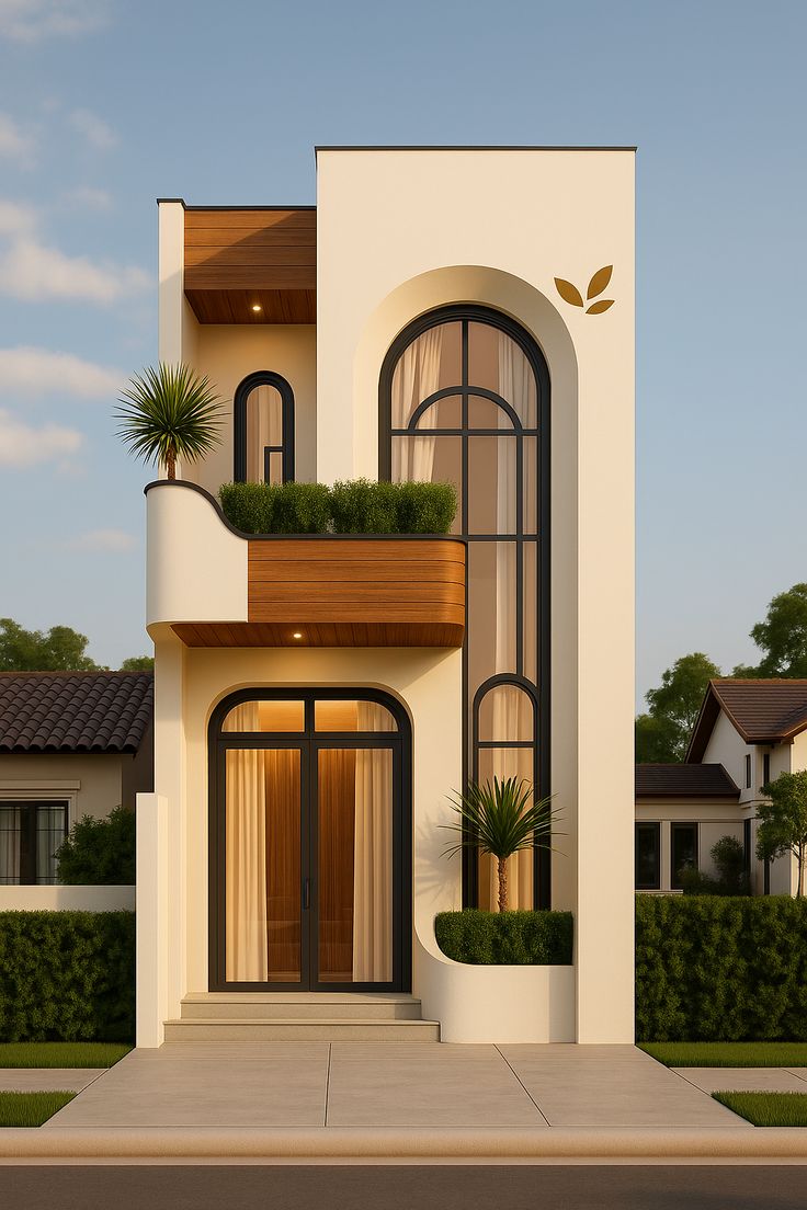 Ngôi nhà gác lửng 5×16m được thiết kế theo phong cách hiện đại pha nét nghệ thuật châu Âu, với mặt tiền bo cong mềm mại – một xu hướng đang được ưa chuộng tại các đô thị trẻ.
