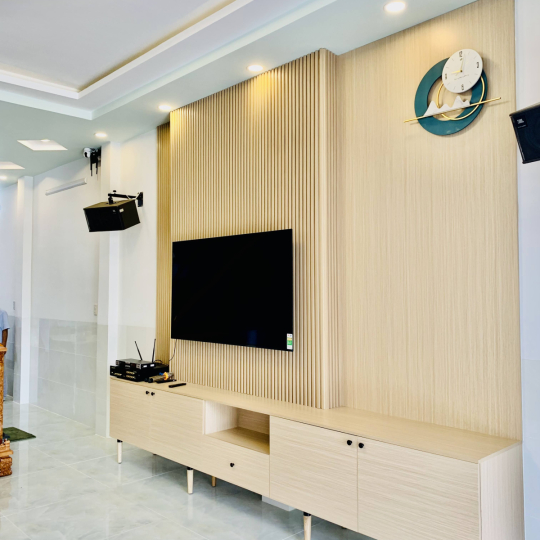 Ngôi nhà không chỉ đáp ứng nhu cầu sinh hoạt hằng ngày mà còn tạo trải nghiệm sống dễ chịu nhờ sự tối ưu về thông gió, ánh sáng và tầm nhìn. Mặt tiền đơn giản nhưng tinh tế, kết hợp hoạ tiết cắt CNC trên cổng và ốp gạch gốm ngoại thất, tạo điểm nhấn thẩm mỹ nhẹ nhàng nhưng bền vững. Đây là ví dụ tiêu biểu cho kiến trúc nhà phố hiện đại tại các khu dân cư mới – nơi yếu tố công năng và thẩm mỹ được đặt song hành.