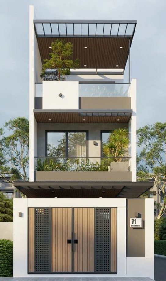 Ban công tầng 2 và tầng 3 được bố trí mảng xanh tươi mát, vừa tạo điểm nhấn thẩm mỹ vừa giúp giảm nhiệt, mang lại cảm giác dễ chịu trong không gian sống. -
