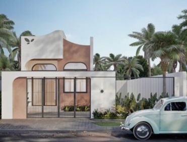 Mặt tiền bo cong + ô cửa vòm, mảng nhấn màu ấm và lam thép sơn tĩnh điện tạo cá tính.