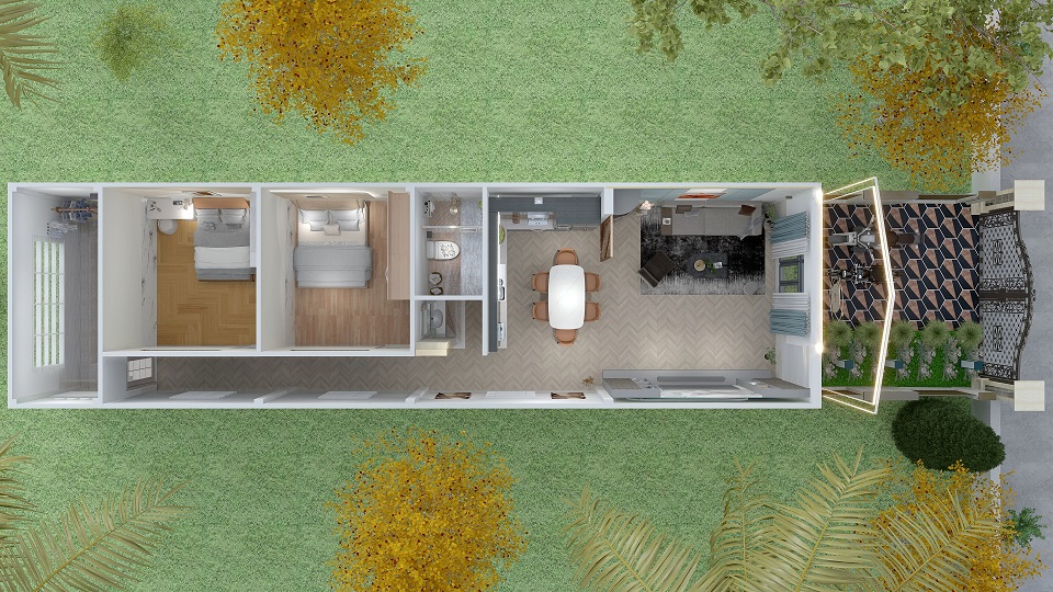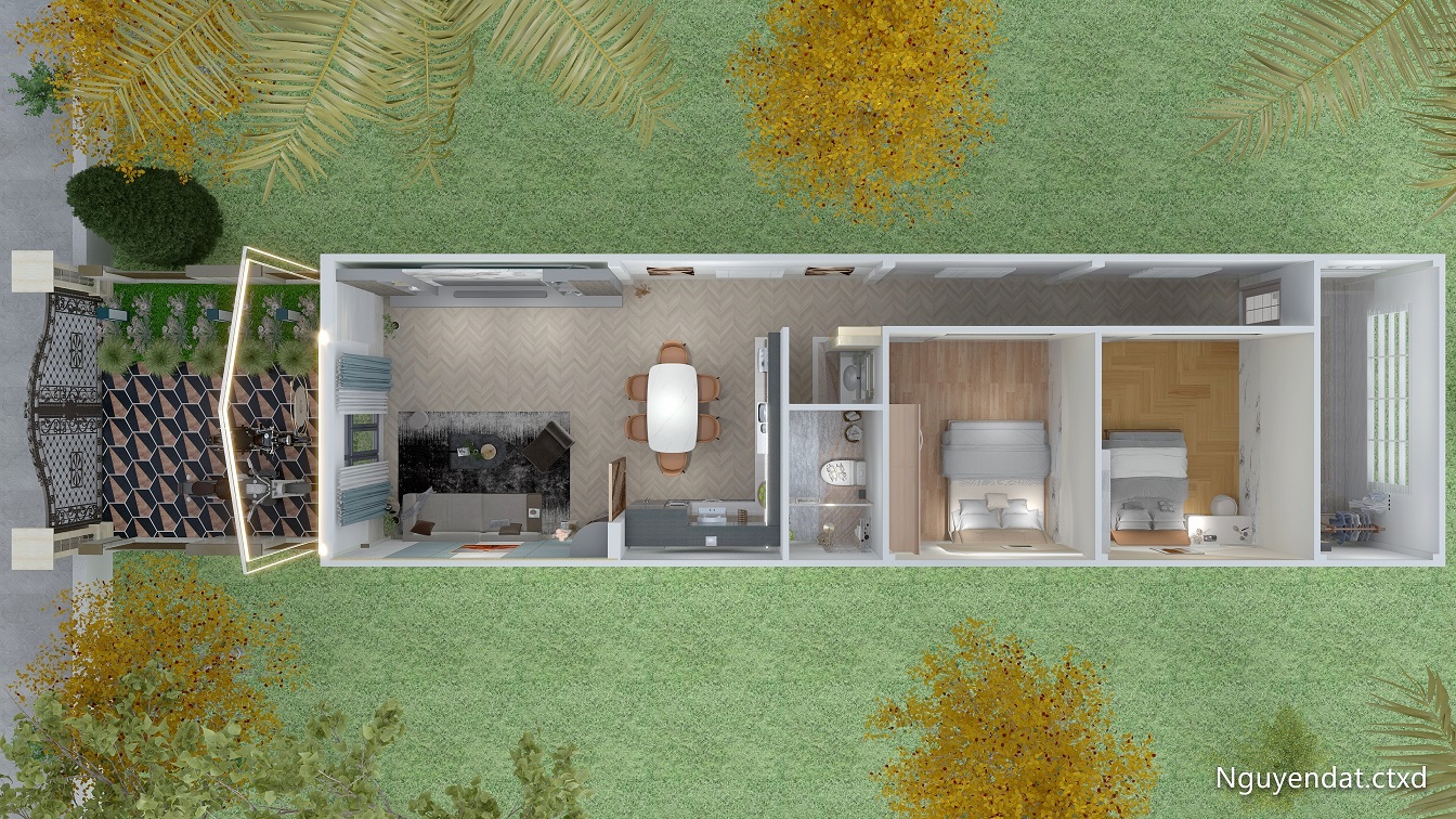 Nhà trệt 5x20m hiện đại – Công năng 2 phòng ngủ, phòng khách liên thông bếp, sân phơi sau – Khái toán 650 triệu