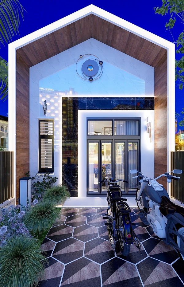 Phong cách: hiện đại tối giản; mặt tiền nhấn mảng vật liệu (đá/gạch thẻ), đèn line LED hắt sáng.