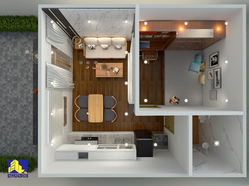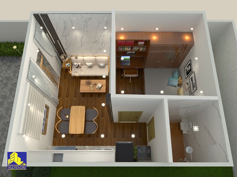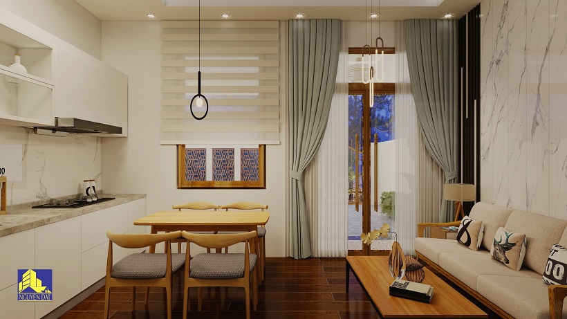 Chiếu sáng & thông gió: cửa chính kính + ô cửa hông; có thể bổ sung ô lấy sáng trần (0.6×0.8m) tại khu ăn/bếp nếu nhà kẹt hông.