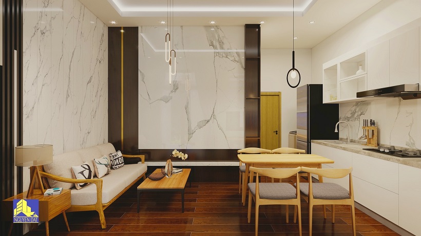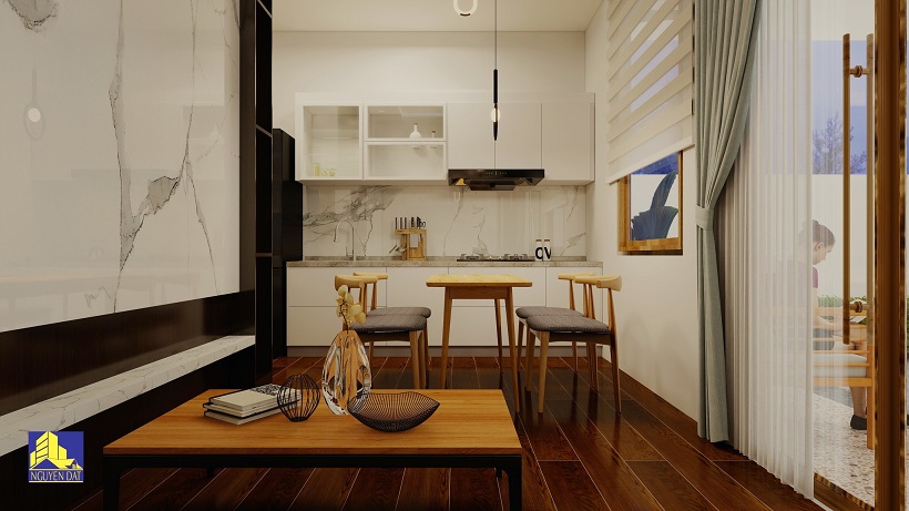 Phòng khách + bàn ăn + bếp (~16–17m²): không gian mở ngay sau cửa chính; bếp bố trí dạng I dài ~2.4–2.8m sát tường, đối diện là bàn ăn 4 ghế. Dễ thông gió, ít mùi.