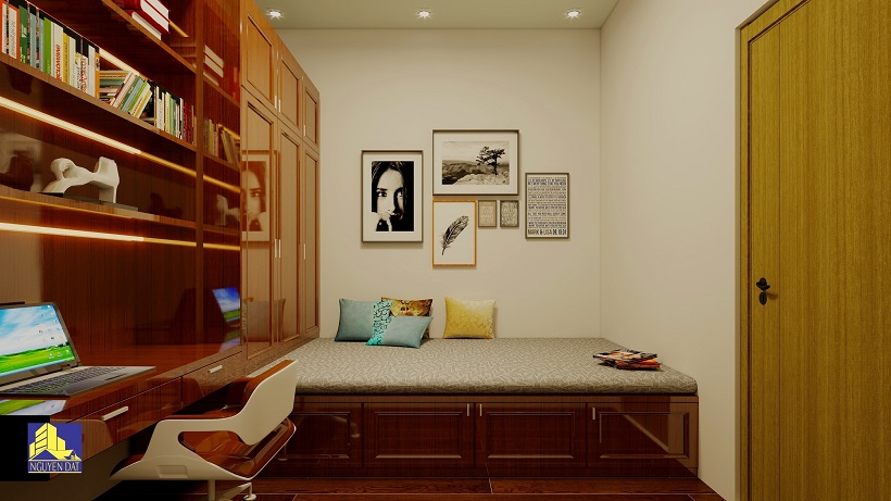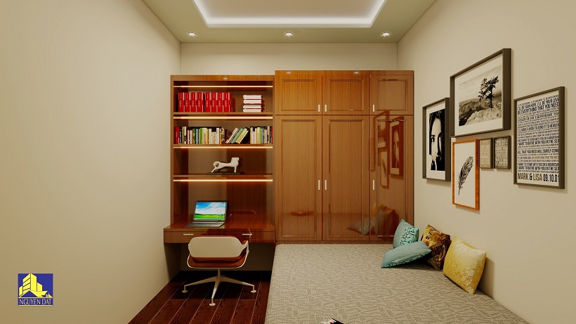 Phòng ngủ (~9–10m²): đặt về phía yên tĩnh, có cửa sổ hông lấy sáng; tủ áo 1.6–1.8m kê sát tường để tối ưu diện tích.