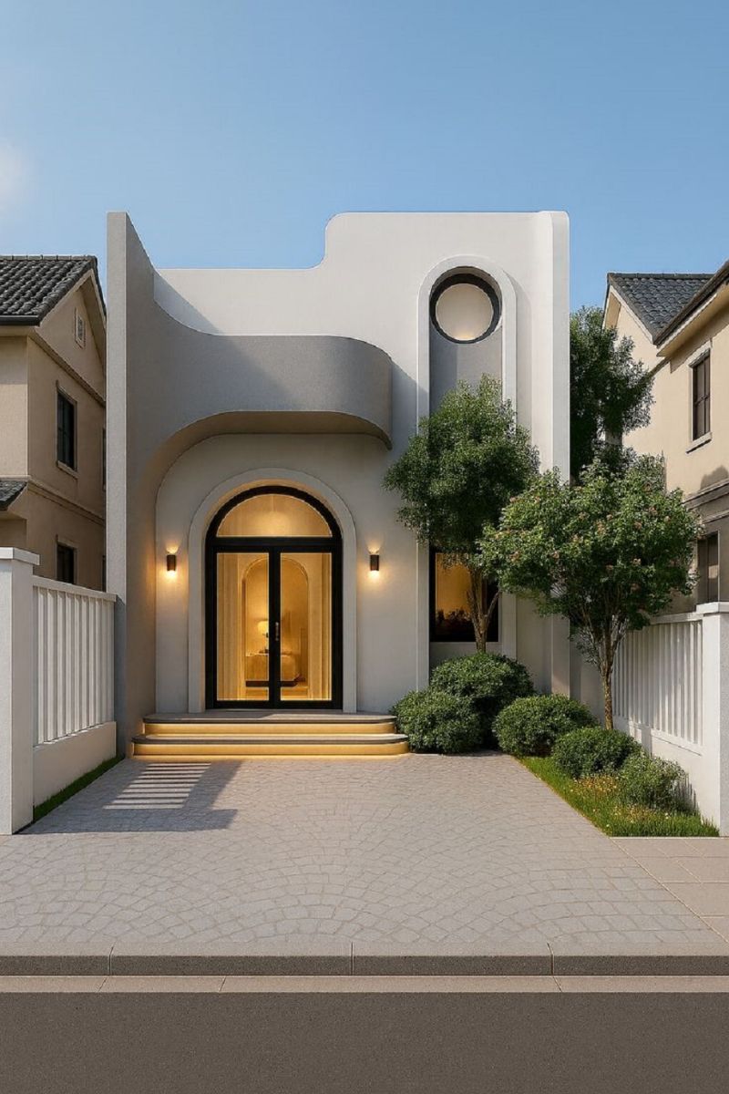 Lấy cảm hứng từ xu hướng Modern Soft Architecture – công trình gây ấn tượng bởi đường cong bo tròn tinh tế, kết hợp các mảng tường phẳng, khung cửa vòm và ô tròn nhấn mạnh ngôn ngữ kiến trúc mềm mại, gần gũi.