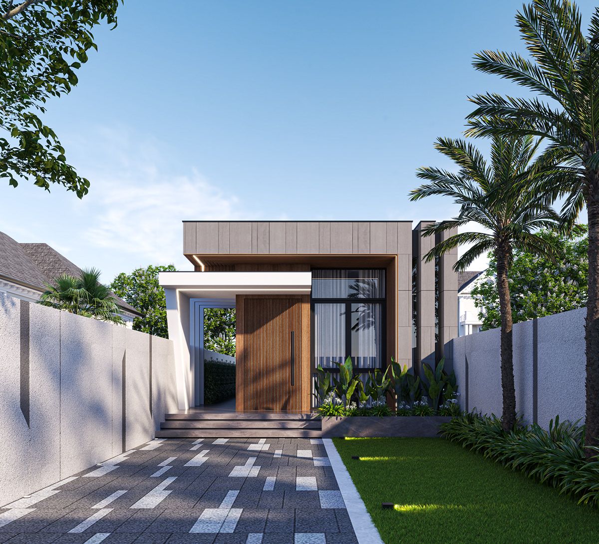 Chừa sân trước ~3,0m để xe + mảng xanh, lối vào có mái che nhẹ.