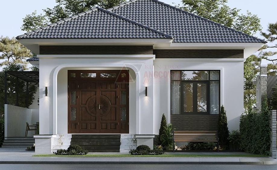 Ngôi nhà nổi bật với thiết kế mái Nhật thanh thoát, sang trọng, tạo cảm giác cân đối và bền vững theo thời gian. Mặt tiền được xử lý tinh tế: cửa gỗ tự nhiên kết hợp hệ thống cửa kính lớn, vừa mang nét uy nghi vừa đón sáng tự nhiên vào không gian bên trong.