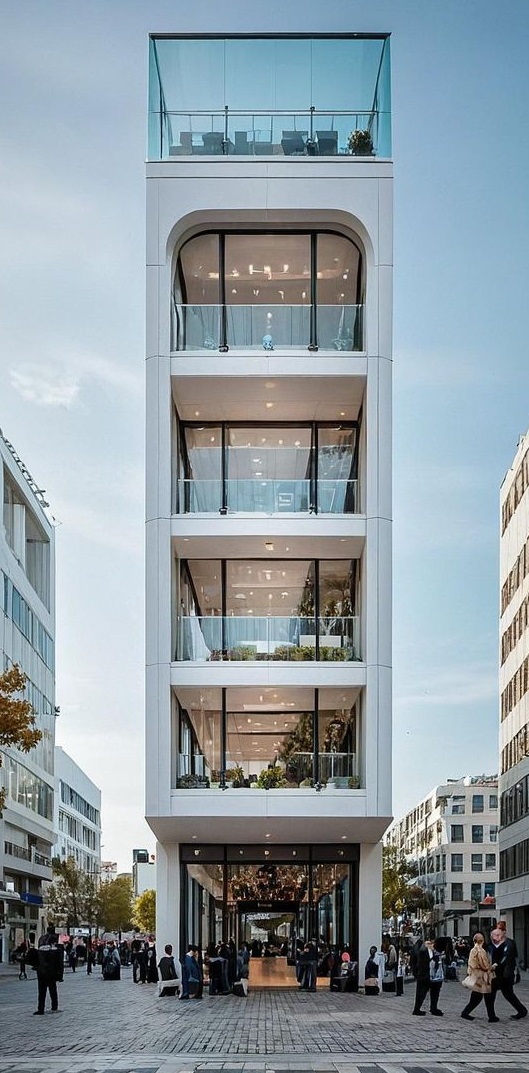 Mẫu nhà hàng 6 tầng 8x30m gây ấn tượng mạnh với kiến trúc mặt tiền bằng kính trong suốt, tạo sự sang trọng, hiện đại và kết nối không gian bên trong – bên ngoài. Mặt tiền thoáng đãng giúp tối đa ánh sáng tự nhiên, đồng thời tôn vinh không gian nội thất và cảnh quan cây xanh.